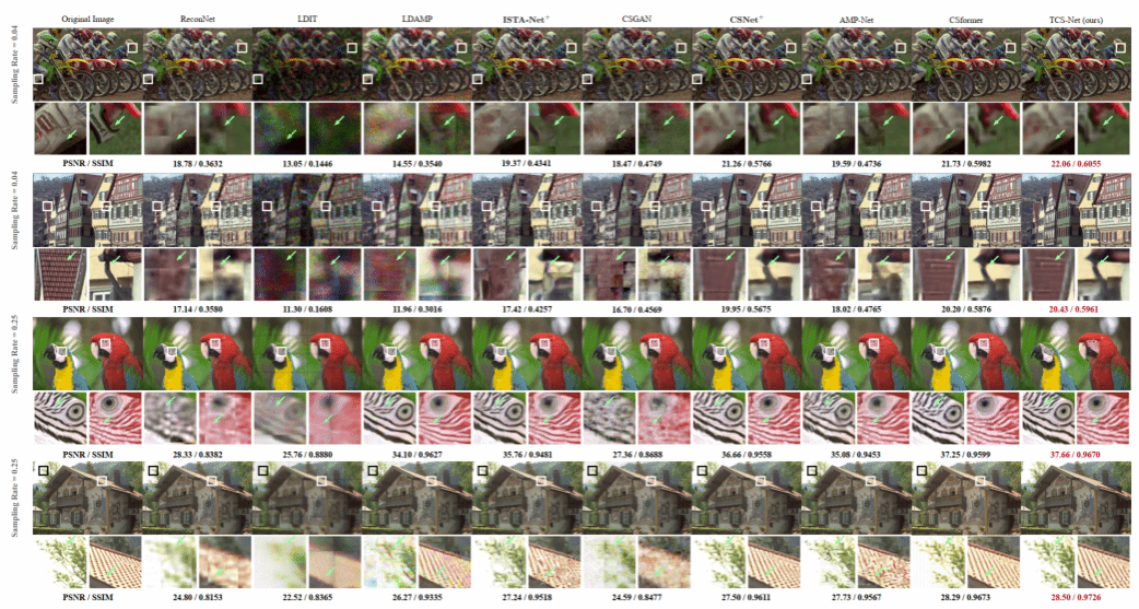 在“From Patch to Pixel: A Transformer-Based Hierarchical Framework for Compressive Image Sensing”文章(IEEE TCI)中,作者提出了一种基于Transformer的级联式图像压缩感知方法TCS-Net,该方法以级联的方式将Transformer作为特征提取器捕获自然图像的长距离特征,并最终建立精细的端到端图像压缩感知映射。该方法摆脱了固有的基于CNN的图像压缩感知模式,并取得了理想图像采样和恢复效果。论文链接://ieeexplore.ieee.org/document/10049603