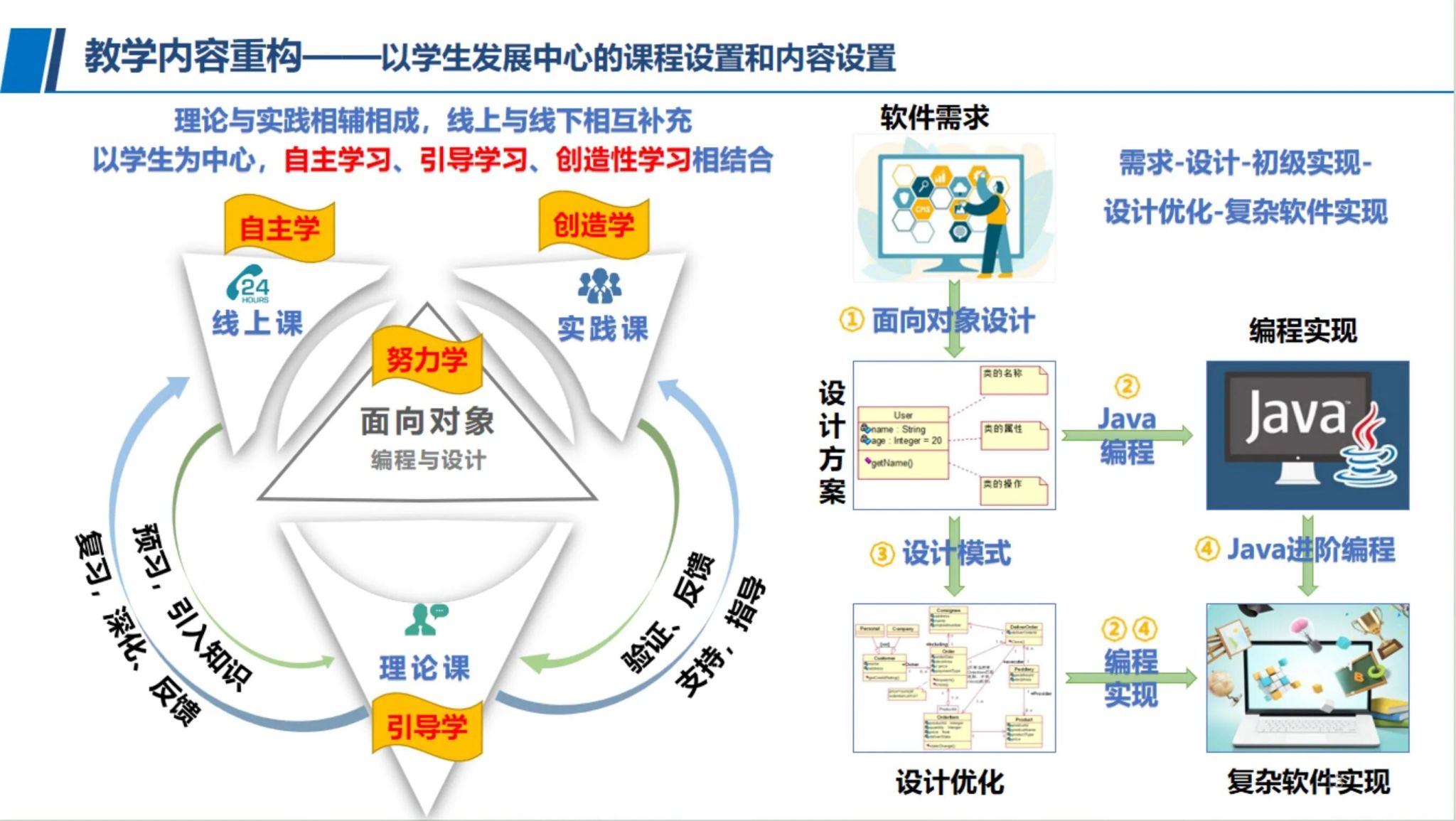 《面向对象编程与设计》课程秉承OBE教育理念和新工科建设要求,构建了理论课、实验课与MOOC课程相结合的混合式教学;课程以学生为中心,实施“自主学—引导学—创造学”三段式教学模式,实现了“理论与实践”相辅相成、“线上与线下”相互补充;课程以特色化大型工业软件案例为支撑,将案例体验与进阶型前沿技术融合;依托混合式教与学过程设计,研制了多元产出评价精准微课堂平台,显著提升了教学质量与学习效率。