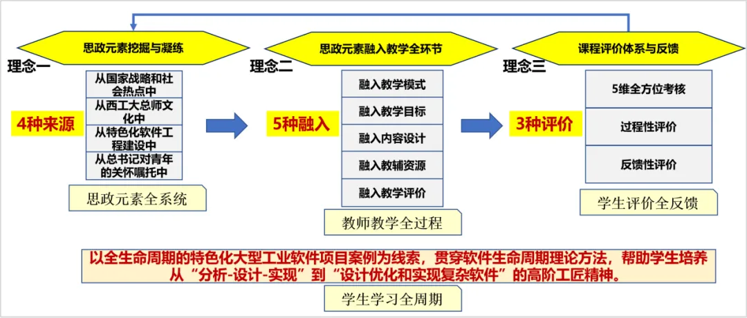 ——大型工业软件方向”的办学定位,深度挖掘提炼专业知识体系中的思想价值和精神内涵,科学合理拓展专业课程的广度、深度和温度。通过面向学生学习全周期、教师教学全过程、培养方案全系统和毕业生就业全反馈的“四全闭环式”持续改进机制有力保障,逐渐形成了“以学生为中心”课内外一体化思政元素全环节融入的课程教学模式,有效激发了学生“为国铸剑”的家国情怀和使命担当。