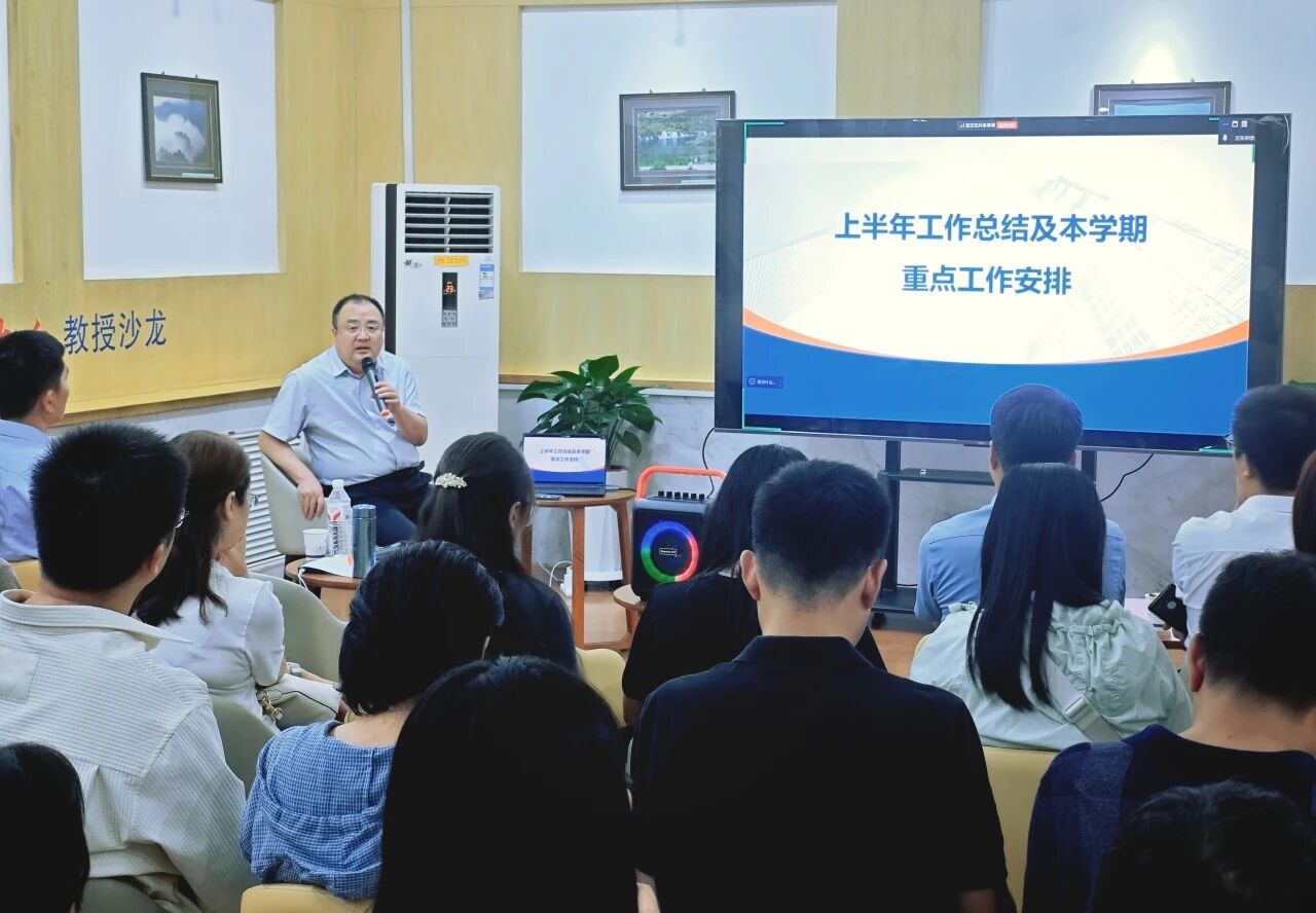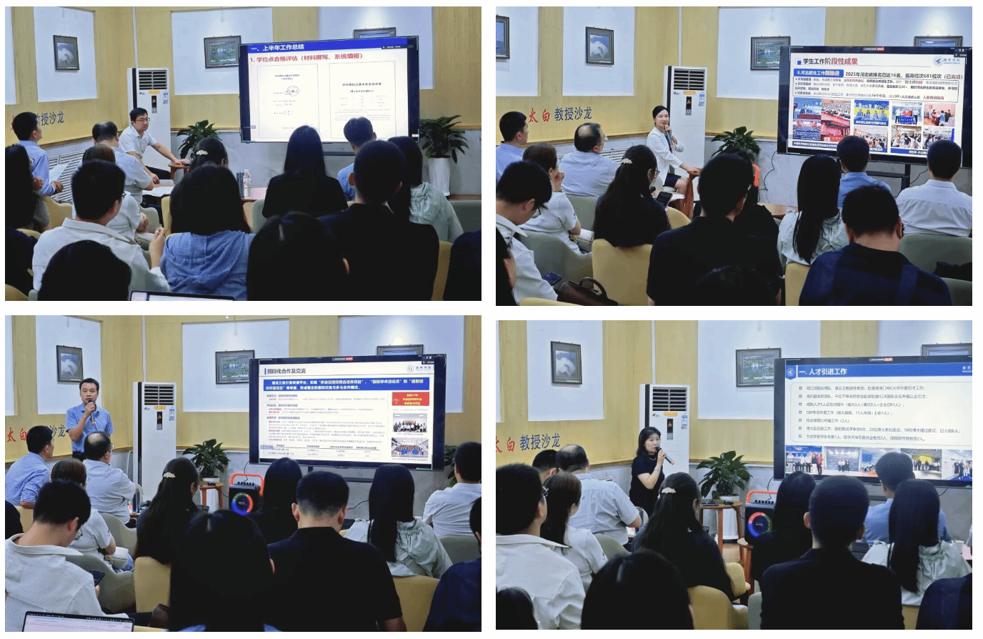 科研攻关“揭榜挂帅”项目推进、科研团队(小组)建设、科研项目申报、保密管理、安全生产工作等重点工作;党委副书记陈博聚焦党建与学生工作,回顾了党建、创新竞赛、共青团工作、学生深造、就业工作、河北招生工作等方面的工作成效,并对新学期重点任务作出了部署;院长助理张凯龙围绕国际化推进工作,总结了引智资源平台建设、优质海外教师引进、国际联合培养、学生出国境交流等方面的成果,并明确了下一步拓展国际合作的目标与路径;办公室主任王宇英就人事与人才工作汇报了人才引进、青年教师培育、人事管理等方面的进展,对下半年人才项目申报、制度与平台建设等重点工作作出了安排。