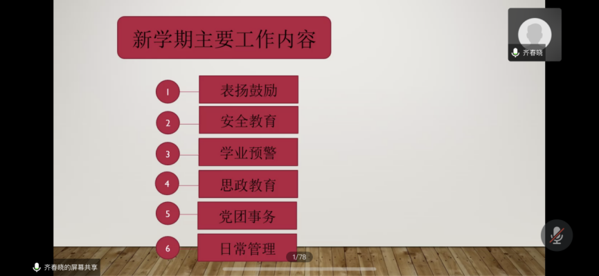 最后,齐老师对本学期的主要工作安排进行讲述。新学期工作内容主要从安全教育、学业预警、日常管理等方面开展。由于目前疫情情况还不稳定,齐老师提醒大家日常要做好防护,每日安全健康报,务必配合JavLibrary
