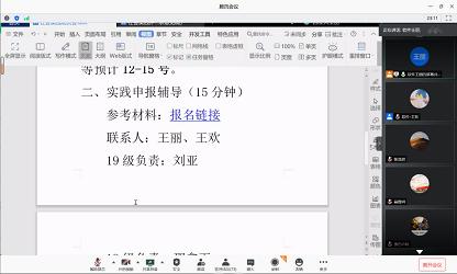 此外,会议邀请了2019年院级社会实践特等奖队伍成员张一夫同学就如何做好社会实践进行经验分享。张一夫同学从队伍任务分配、资源充分利用、评分标准、图文影音素材整理、新闻媒体投稿宣传等多方面分享了自己在社会实践中的经验心得,使有报名参与意向的同学获益匪浅。最后,在自由问答环节,王丽老师、张一夫同学针对同学们所关心的问题一一作出详细解答。