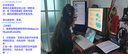 团委组织各支部和广大团员青年开展各项志愿服务、策划秦团抗疫主题团日活动、在线实践、“三航杯”竞赛组织等多项工作,同时王老师承担的第一门本科课程也因为疫情防控的需要采用在线教学模式。作为教学初探者的王丽,为了做好教学工作,虚心向其他老师请教教学技巧,跟教学组的老师反复研讨,在课程内容展开、在线提问和历史背景知识导入等方面做了精心设计。在试讲测试的时候,第二次测试由于白噪音的影响效果不佳,为了再次确保上课效果,当好最美主播,她连夜调试更新设备,用“三个屏幕+机械键盘+专业话筒和耳麦“为自己搭建了工作台,只为用最好的状态和学生在云端相见。第一次网课结束,她这样记录:“疫情当前,冰冷的是病毒、温暖的人心,受损的是身体、不摧的意志!我在长安、你在各地,我们携手“停课不停学”,在未来的日子里,我会继续努力、积极请教,争取做一名合格的人民教师,让知识和情怀的传承继续!”