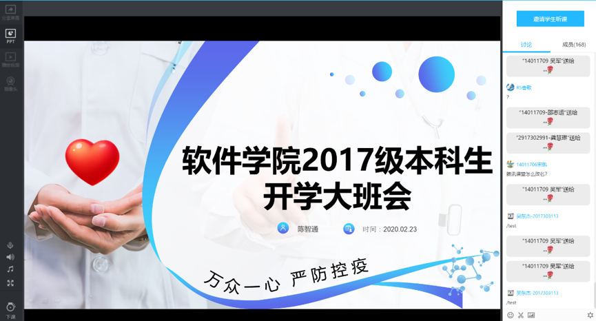 做好统计工作;保持健康心态,落实居家学习。同时,陈智通老师也对前段时间同学们关注比较多的问题,如通过什么途径能联系上授课教师、没有教材怎么办、上学期不及格的课程什么时候补考等等,一一做了解答,再次重申3月2日之前不得返校,希望大家等候耐心等候具体返校通知。