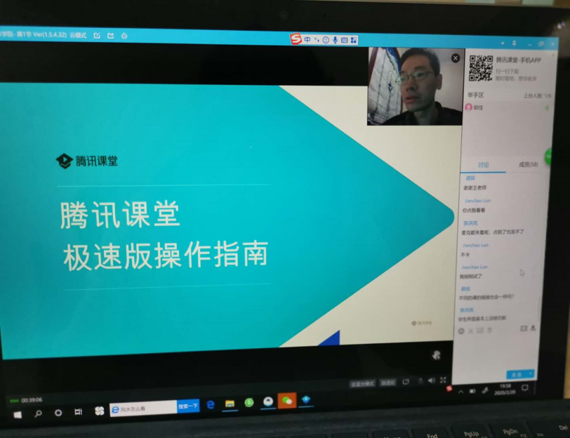 王犇老师通过腾讯课堂的客户端给大家演示了在线课程的各个方面、详细介绍了腾讯课堂直播的操作指南,同时也讲解了钉钉课程直播、基于WPS下的课程录播、校内课程平台等在线教学方式的使用方法及优缺点。结合王犇老师的讲解,教师们也各自提出了自己的意见和建议,对这些在线平台不足之处的解决方案开展了在线讨论。