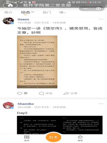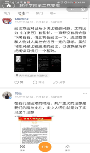 研究生第二党支部组织线上阅读打卡活动,在学生居家防护期间,保持学习,丰富假期生活。本次活动目前共有25名成员参与打卡,打卡次数截止今日累计36次。