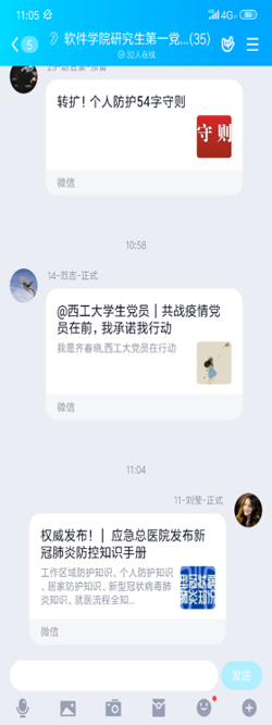 在这场防控疫情的斗争中,学生党支部充分发挥基层党组织战斗堡垒作用和党员先锋模范作用,先后以不同形式开展支部活动,积极宣传防控知识、交流学习经验、关心同学、坚决不信谣不传谣,以实际行动支持着这场战役。