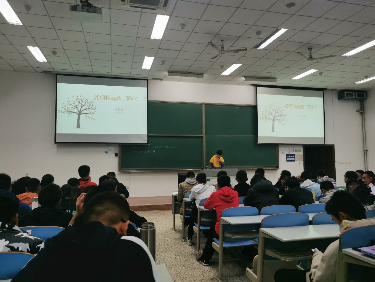 随后,何畅浩同学以“如何将高数同化”为主题,分享了自己学习高数的一些经验以及方法,比如做笔记的重要性和如何做笔记,做题及认真纠正错题并及时复习,以及对于同学们出现“上课听不懂”的问题给出了“别害怕”的回答,使同学们增加了对今后高数学习的信心,也有了更加清晰的认识和规划。