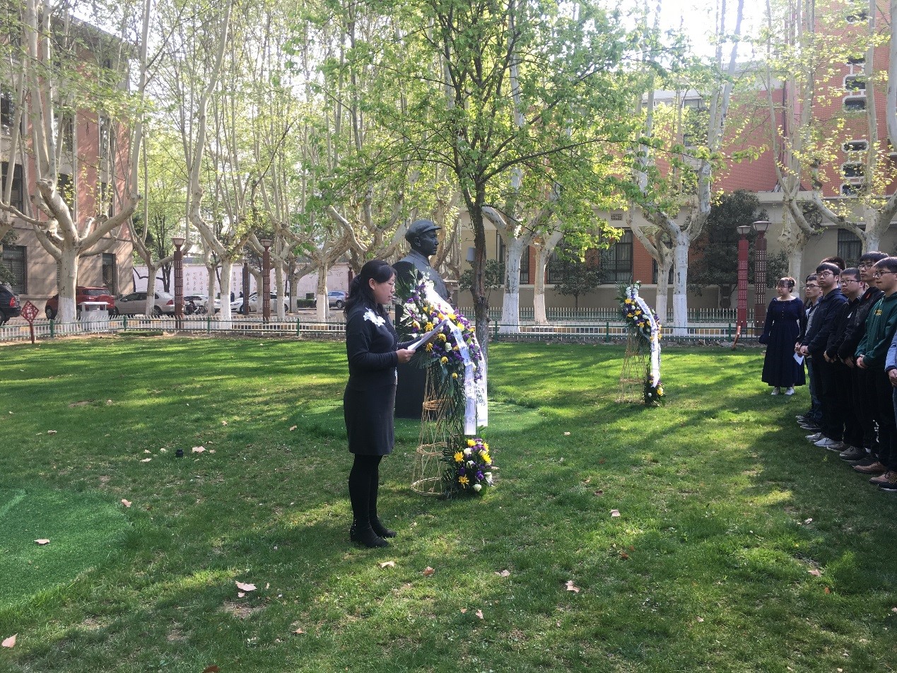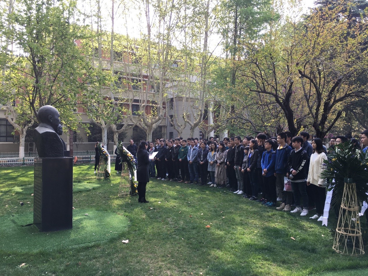 上午9时30分,金色的晨光穿过梧桐大道,百余名师生来到诚字楼三位先辈雕塑前参加本次清明纪念活动,活动场面安静肃穆。