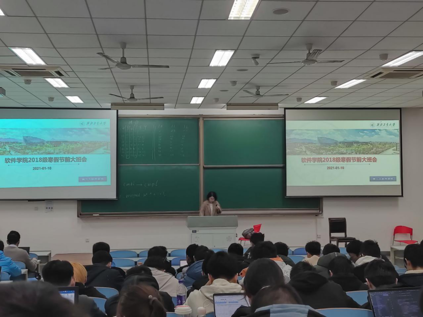 寒假放假通知的文件精神,叮嘱同学们在离校前,打扫宿舍卫生、关闭所有电源、带好贵重物品和证件、在返家途中做好防护,并强调了留校和返校的注意事项。其次,寒假期间,同学们要合理安排时间,制定寒假小计划,鼓励大家回家能够“带一本书阅读”。针对考研的同学,应该利用假期时间了解目标院校的招生简章,做好考研的准备和复习;对于就业的同学,要求每人制做一份简历,并积极投递招聘单位,做好就业前的实习准备。在家期间,不能放松对疫情防控的警惕,每日要按时填写健康报,养成良好的作息习惯、卫生习惯、饮食习惯。同时也应警惕各类电信诈骗,不在网络上借贷校园贷等不明贷款。最后,齐老师从奖助学金制度、家庭经济困难认定、班团建设等方面分析了2018级本学期存在的问题,并针对这些问题提出了相应的解决措施和下学期的工作安排。