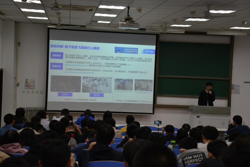 最后,百度在线网络技术(北京)有限公司人工智能技术专家倪峰对百度赛题和相关技术趋势进行了解析。在对赛题进行进一步讲解之后,倪峰还对飞桨(PaddlePaddle)作了进一步的介绍,并向同学们展示了多目标跟踪算法和baseline的相关运用。他指出飞桨是集深度学习核心框架、工具组件和服务平台为一体的技术先进、功能完备的开源深度学习平台,对同学们完成赛题具有重要的作用。