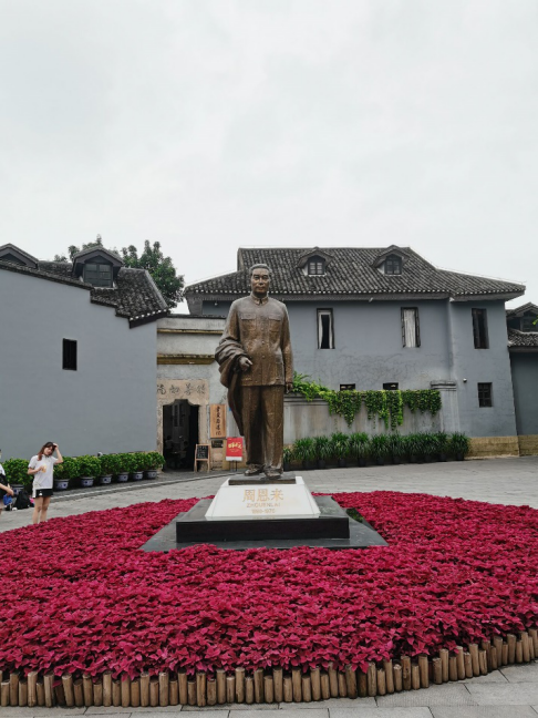 公馆前是曾家岩广场。曾家岩广场中央矗立着一尊周恩来风雨兼程、辛勤奔走的全身铜像,驻足于前,令人肃然起敬。“周公馆”是周恩来总理在抗战时期重庆的居所。一栋砖木混合结构的小楼,正中设有天井,古朴而神秘,灰墙青瓦,外表优雅,安静地坐落在路边,似一位历经风云变幻,满面沧桑的老人,向经过它、走近它的晚辈们讲述段段往事。