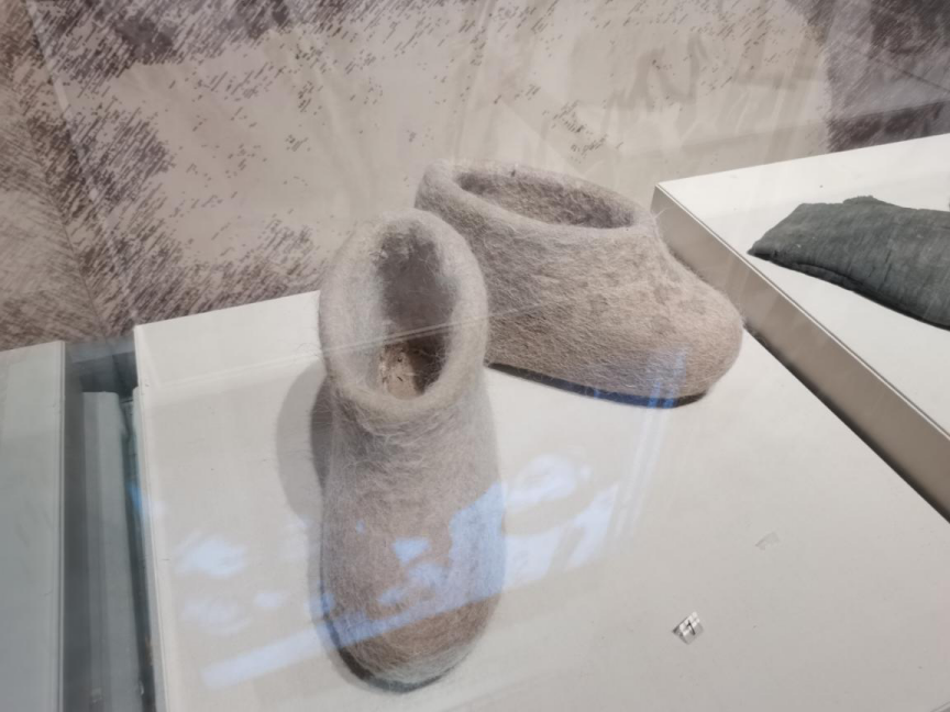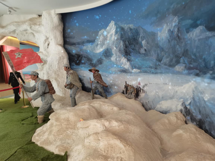 纪念馆中让人感触最深的是红军翻越雪山时的雕塑,战士们的脚深陷在草地之中,风雪撕扯着他们的衣衫,但他们仍心怀信念。展台上的毡靴、草鞋和旧布包让队员们不禁感慨:红军长征精神是他们用鲜血与生命铸成的,他们不惧枪林弹雨,忘却生死哀伤,只为了心中的理想和信念。红军的如此壮举,值得每一位青年去铭记。