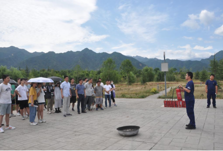 室外灭火器实操演练环节,胡涛讲解了消防器材类型、灭火器使用要点和初期火灾处置等基本知识,并在室外现场模拟起火,指导师生分批正确使用灭火器。