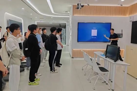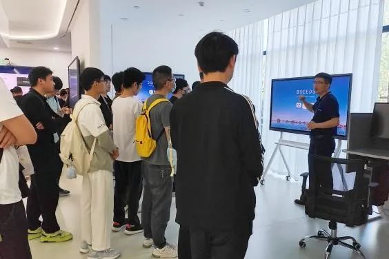 在一楼展厅内,西安视源时代电子科技有限公司的售前经理闫良涛、程森向同学们介绍了希沃和青松系列产品。这些产品不仅具有高度的科技感,而且能够适用于多种场景,满足个人、企业、社会的各种需求,具有广泛的市场前景。