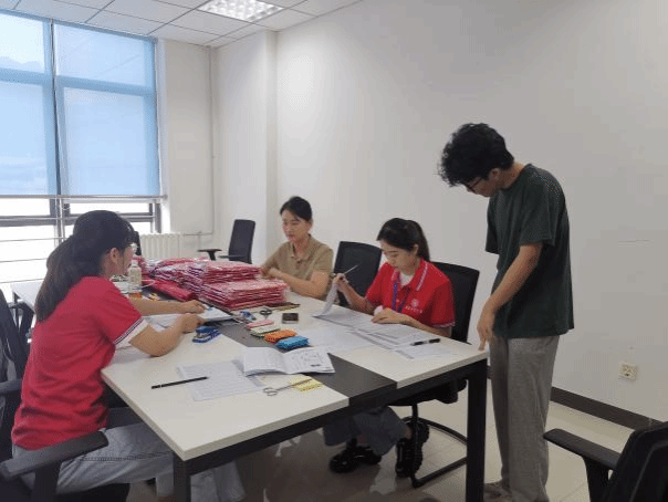 进行资格审核,并为营员发放入营服装、餐券等,营员们依次排队办理,秩序井然。