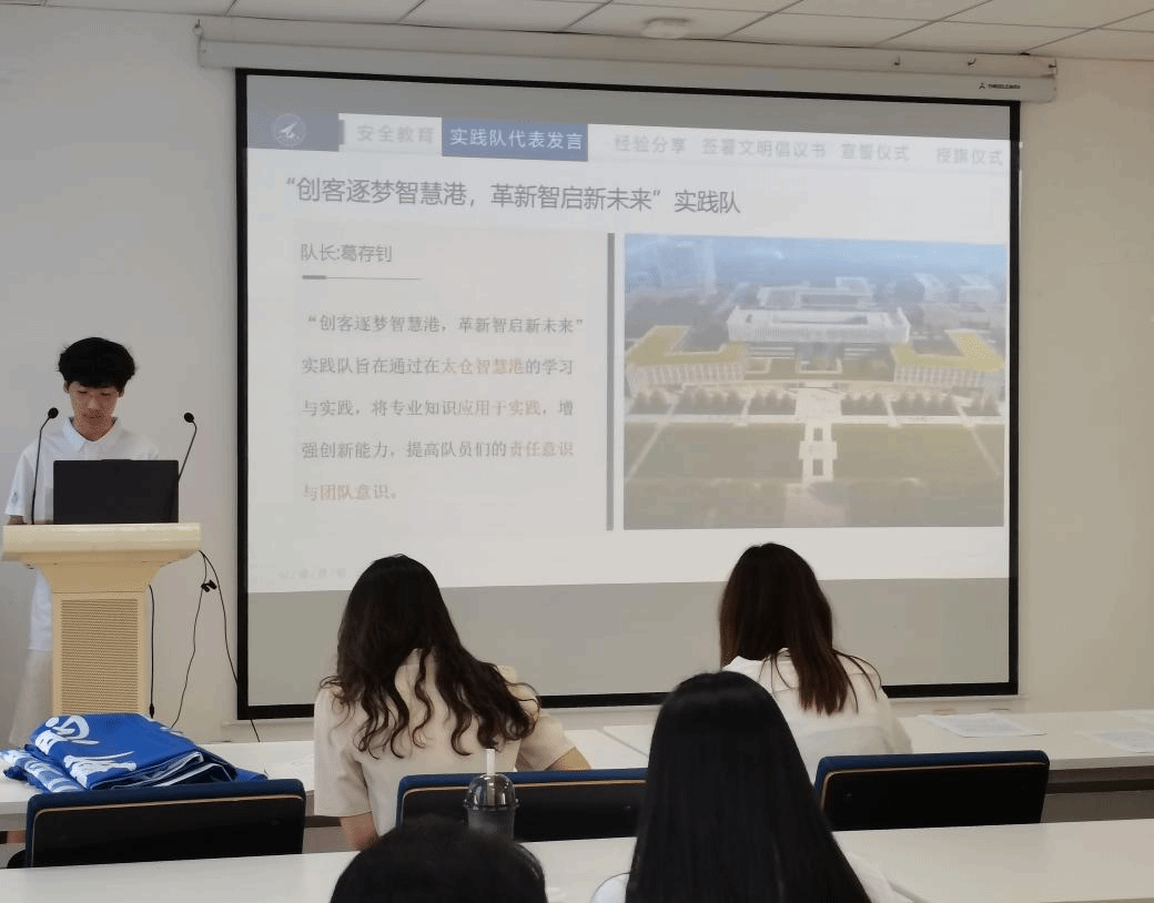 随后,暑期实践队队长代表进行发言。“调访秀美秦巴,绘写振兴画卷”实践队队长魏睿泽介绍该实践队旨在通过对镇巴县的调研与考察,解决农民的实际问题,助力乡村振兴。“创客逐梦智慧港,革新智启新未来”实践队队长葛存钊介绍该实践队旨在通过在太仓智慧港的学习与实践,将专业知识应用于实践,增强创新能力。