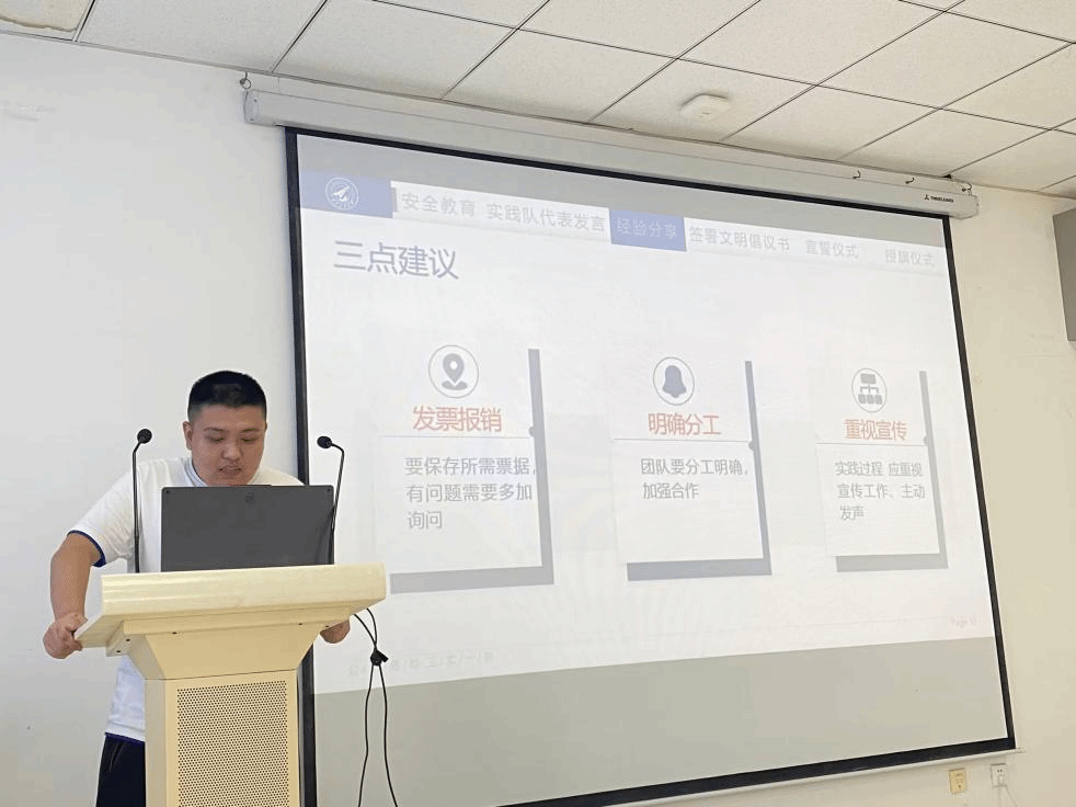 大会伊始,张记国进行了安全教育宣讲,从防范气象灾害、注意交通安全、财产安全、卫生安全以及注意防暑五方面展开。同时鼓励实践队队员在实践中增长见闻,争取获奖,提升时间质量,了解专业发展情况、就业情况等,做好人生规划。
