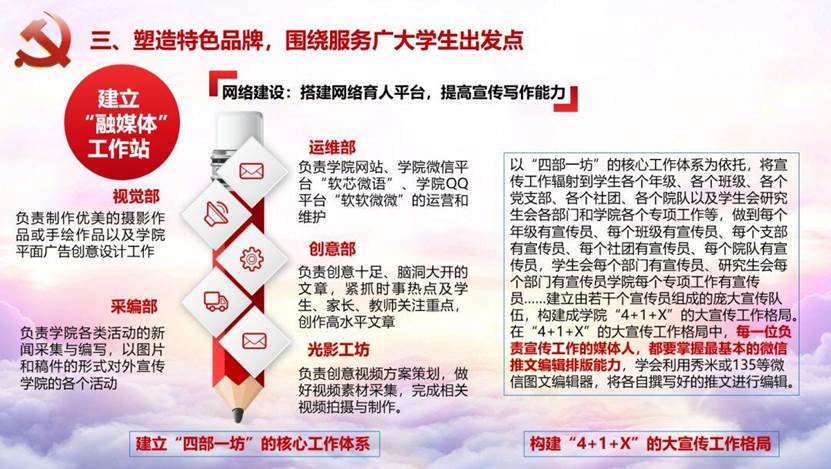 融媒体工作站,建立“四部一坊”的核心工作体系和“4+1+X”的大宣传工作格局,不断培养更多有能力、有责任感的媒体人;
