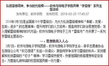 利用微信公众号“软芯微语”发起一份倡议,鼓励同学争当学习雷锋的标兵,为营造礼貌和谐的校园氛围贡献一份力量,并从“思想教育入人心”、 “美化校园点滴行”、 “环保捐赠献爱心”、“社会服务公益行”四个方面开展弘扬雷锋精神,争当时代楷模 “学雷锋”系列主题活动,组织团支部进行了校园环境美化、电脑志愿维修、单车整齐摆放、旧书爱心传承等活动,同时在东大彩色童年幼儿园开展“大手拉小手”主题团日活动,同学们教唱《学习雷锋好榜样》,深情讲述雷锋故事,展现新时代大学生积极向上的精神风貌。