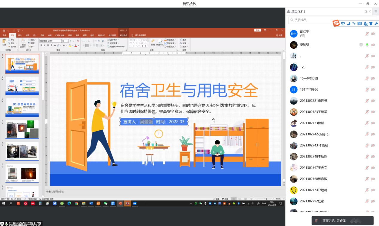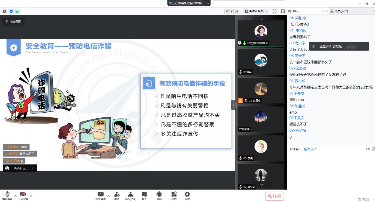 学生公寓管理规定》,争当文明宿舍;通过电信诈骗真实案例,提醒同学们多关注反诈骗宣传,提高自身防骗能力,不占小便宜,并再次强调学生不要受到不良言论煽动,要提高自己明辨是非的能力。