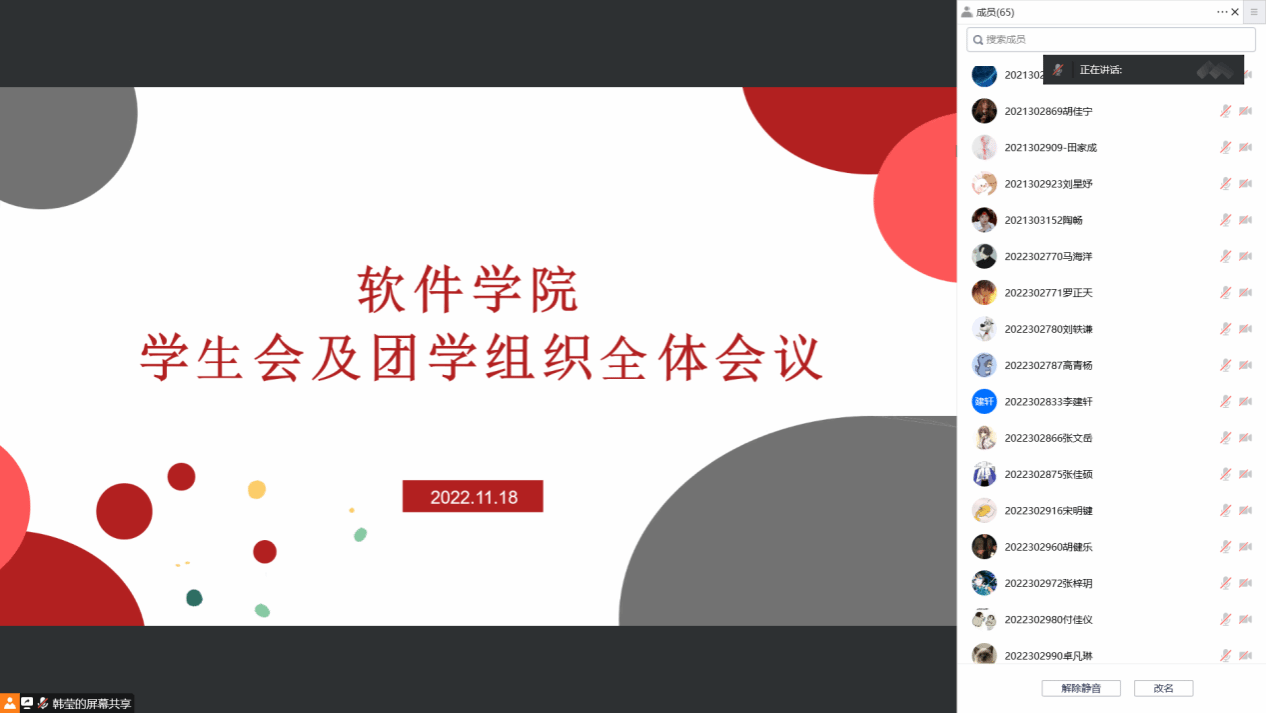 团委书记张记国、团委副书记胡雅心、学生兼职团委副书记罗毅、韩莹以及2022-2023届学生会及团学组织全体成员参加会议,会议由韩莹主持。