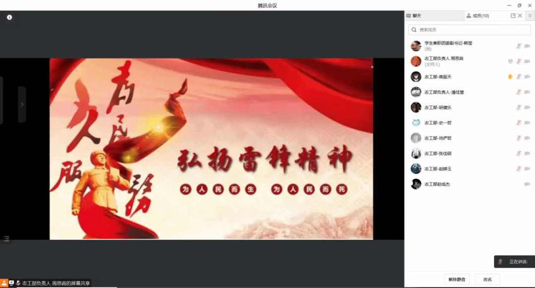 团学组织志工部于线上召开了弘扬雷锋精神——志愿服务理论知识学习会,会议伊始,大家共同观看了雷锋同志的感人事迹视频——赠言战友、帮助老人、背残疾人过河,并提出了本次会议的主题—弘扬雷锋精神。柳智文同学围绕“什么是雷锋精神”与大家进行分享。他提出,雷锋精神是以雷锋名字命名,以雷锋精神为基本内涵,在实践中不断丰富和发展的革命精神。其实质和核心是全心全意为人民服务,为了人民的事业无私奉献。潘佳慧同学向大家介绍了志愿服务的三个标准以及志愿服务的四个基本理论,并从实际上对本学期志工部工作进行了安排,并倡导全体成员积极参与到各项志愿活动中,让志愿之花得以绽放!