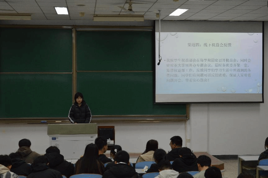 层面的权益反馈渠道及流程。她讲述了如何通过校学生会、校园网、微信公众号等平台提交权益问题,并说明了反馈的处理流程和时限。李婧滢特别提醒同学们,在反馈问题时要注意信息的准确性和完整性,以便相关部门能够快速响应并解决问题。