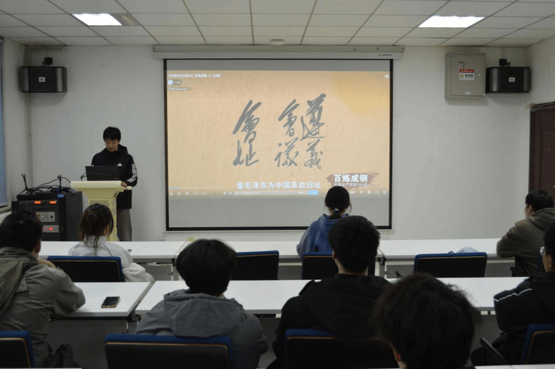 活动第二项,与会师生共同观看纪录片《百炼成钢:中国共产党的100年》精选片段。影片通过珍贵的历史影像与生动讲解,再现了中国共产党领导人民在革命、建设与改革中的壮阔历程。长征途中“半条被子”“强渡大渡河”等经典事迹,深刻诠释了共产党人与人民群众的血肉联系,引发在场学生强烈共鸣。