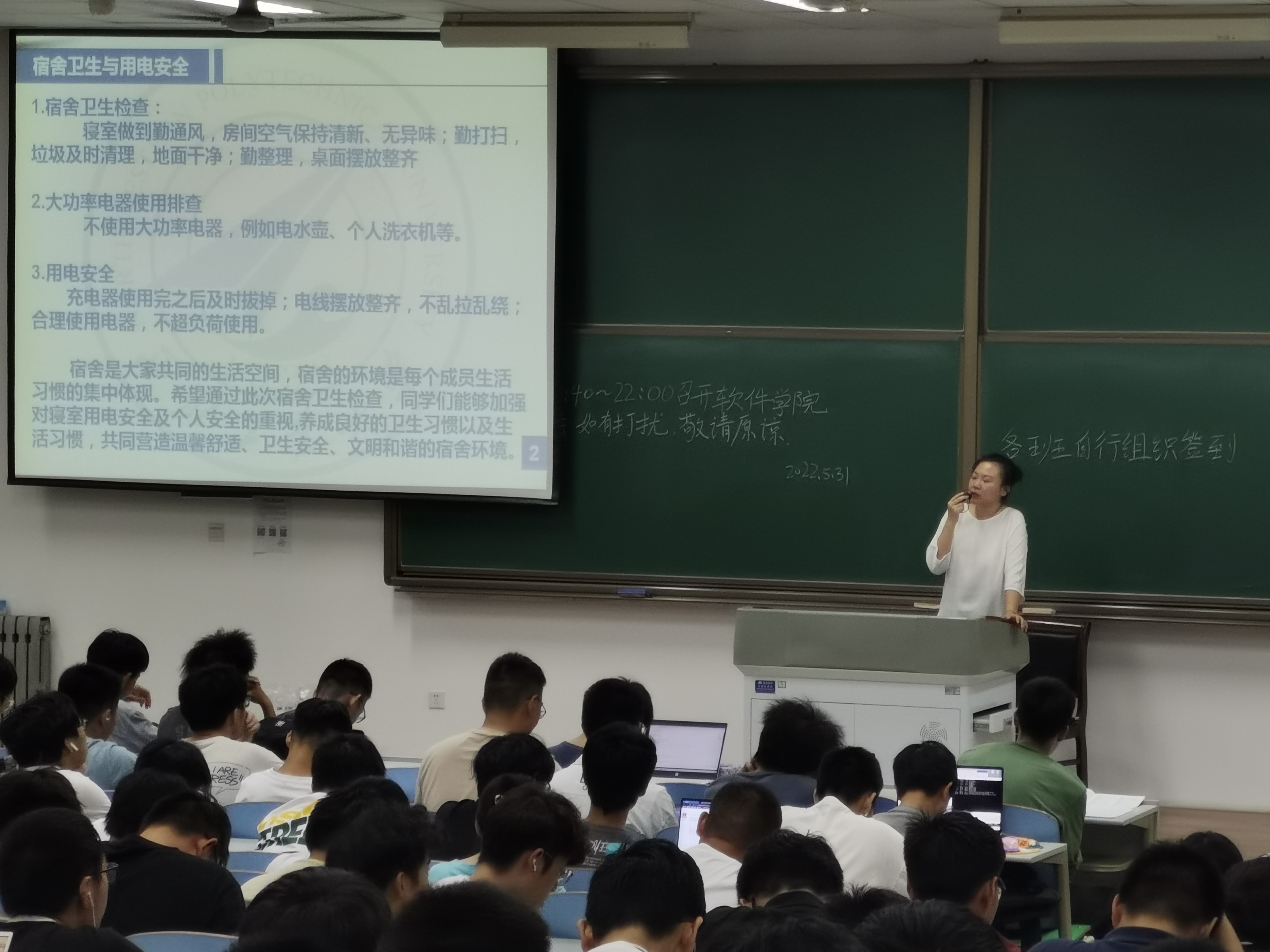 于教西D201召开2020级本科生安全教育大班会,2020级本科辅导员张欣颖、两位兼职辅导员以及2020级全体本科生参会。