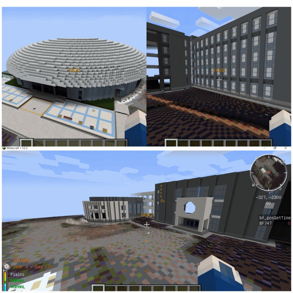 内部拍摄的照片、无人机扫描生成的3D模型以及卫星图像,将游泳馆的外观、教学西楼以及两教学楼周边的道路和绿化景观,精确地复原出来。他们严谨地审视图像与模型,确保各个细节的精准度,运用游戏中的立方体雕刻工具、Blockbench建模软件、独特材质、光影表现及纹理贴图等技术,以增强模型的真实感和精细度。同时团队成员在Blockbench建模中通过精确的比例控制和边缘处理,成功解决了模型大小适宜性和拼接连贯性的关键技术问题,优化了模型在Minecraft平台中的呈现效果。