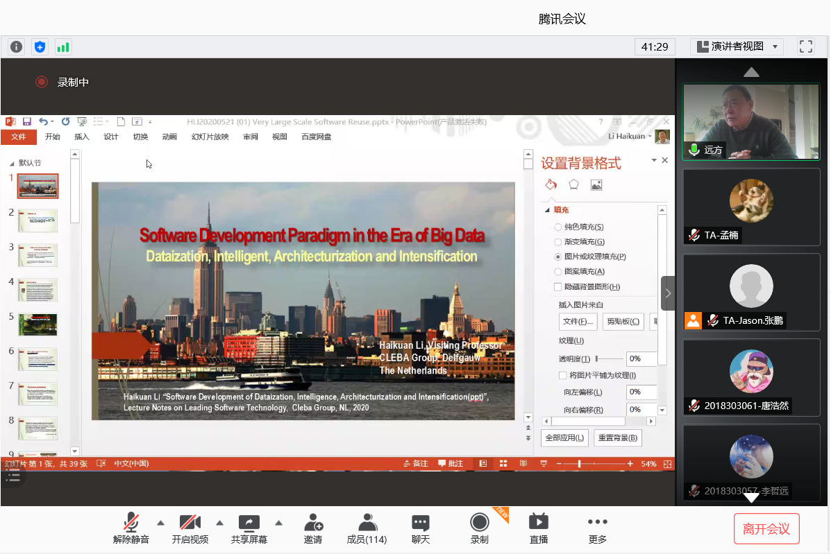 “大数据时代的软件开发模式与技术”(Software Development Paradigm and Technology in the Era of Big Data)全英文课程在线上顺利开课。本次课程邀请李海宽教授主讲,选课人群涵盖本科生、研究生和留学生,选课人数达124人。