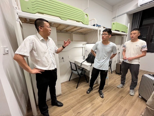 领导和老师们对同学们在未来两周的生活环境进行了查看并指导学生安全使用宿舍的电器设备。