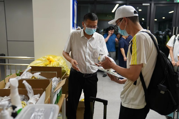 校党委副书记万小朋、党工委副书记陈洪亮迎接学生并为学生发放物资
